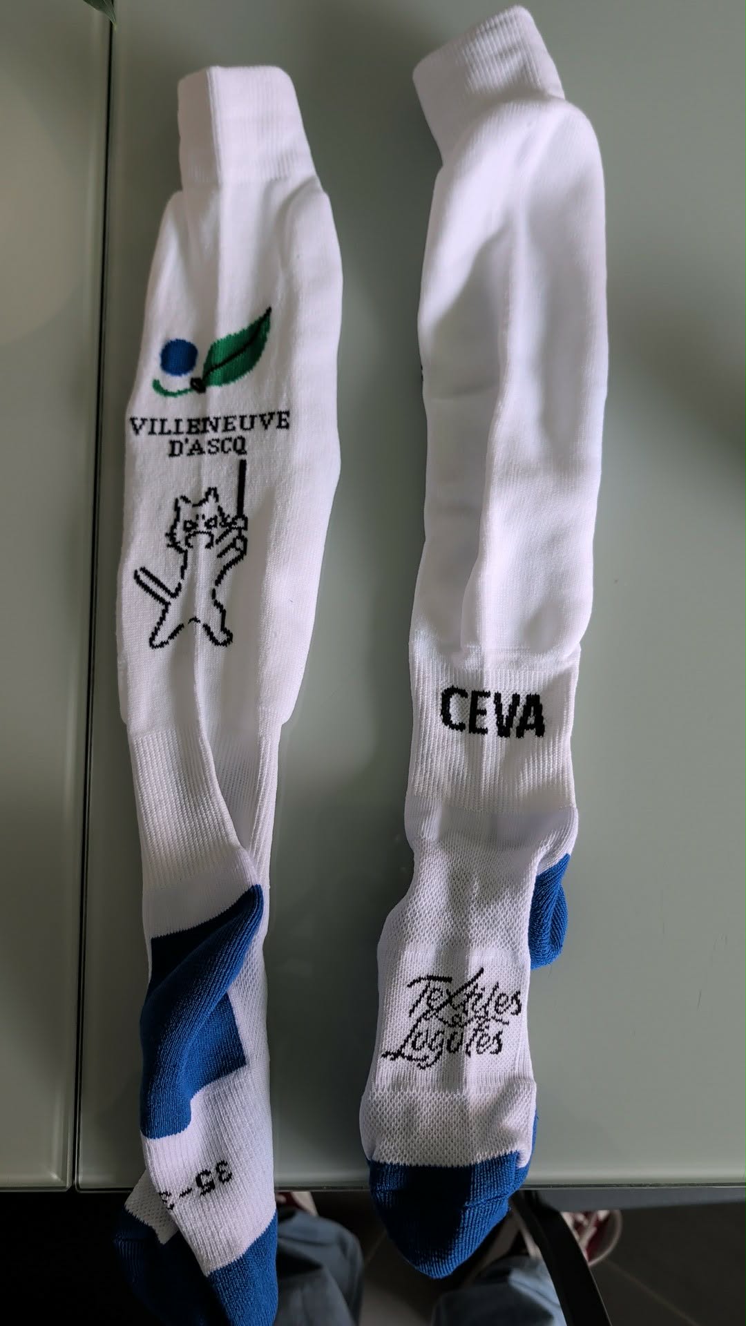Le suspense est enfin levé ! Les fameux colis tant attendus sont arrivés… des chaussettes d’escrime personnalisées à l’effigie du club, réalisées en collaboration avec Textiles Logotés.
